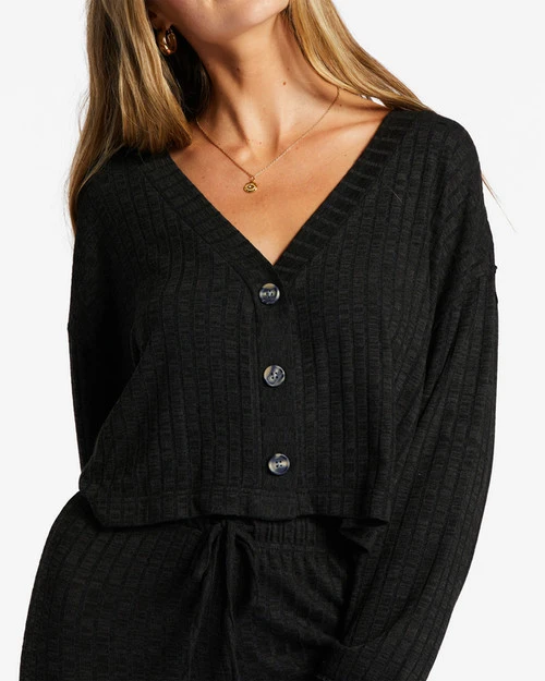 Made of ribbed knit fabric that’s dyed for a heathered look, the Keep On Cardigan has a V-neck, front buttons, and a boxy fit that looks great on it’s own or layered over your cropped tanks and tees.